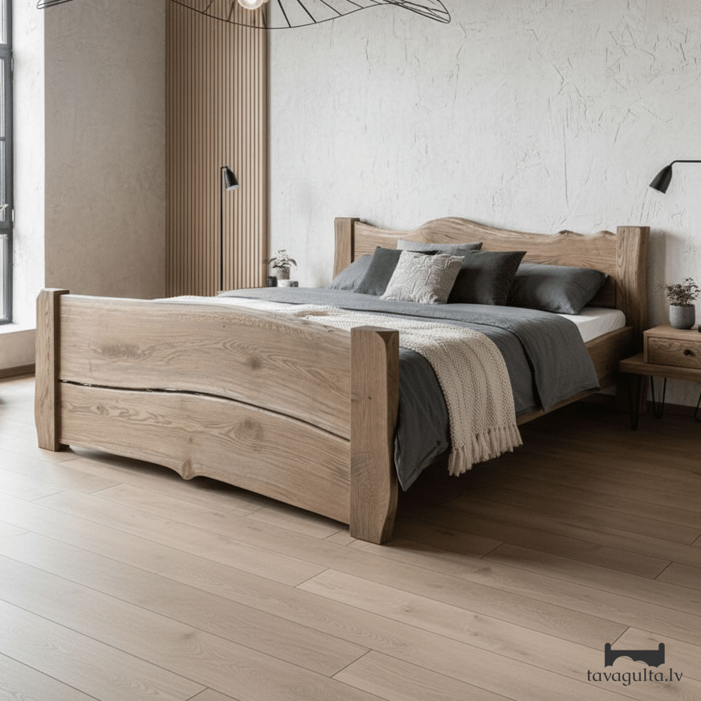 Gultas kāju izmērs ir 80 x 80 mm. Visas nesošās detaļas, kas ir paredzētas slodzei, gatavojam no 40 mm bieza materiāla, kas garantē izstrādājuma ilgmūžību. Detaļas, kas pilda tikai vizuālo funkciju, tiek gatavotas no 25 mm bieza materiāla.
