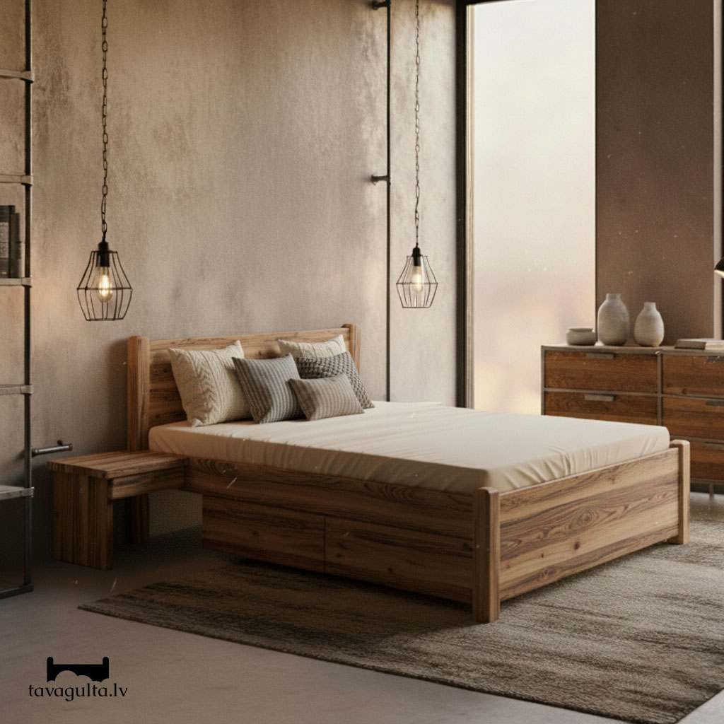 Gultas kāju izmērs ir 80 x 80 mm. Visas nesošās detaļas, kas ir paredzētas slodzei, gatavojam no 40 mm bieza materiāla, kas garantē izstrādājuma ilgmūžību. Detaļas, kas pilda tikai vizuālo funkciju, tiek gatavotas no 25 mm bieza materiāla.